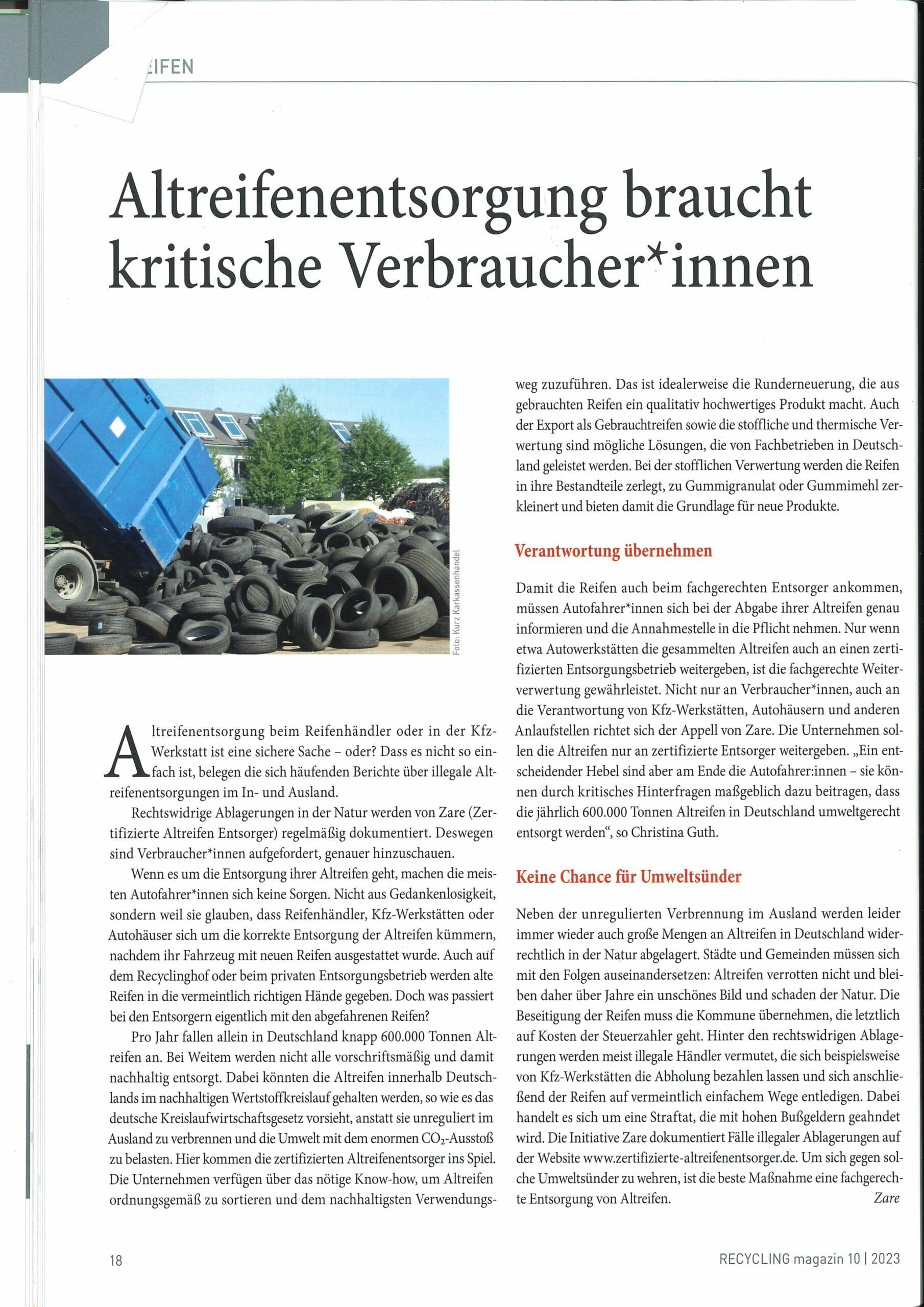 Der Aufruf zur kritischen Verantwortung bei der umweltgerechten Altreifenentsorgung wurde im RECYCLING Magazin 10/2023 veröffentlicht. Darin wird eindringlich dazu aufgerufen, die korrekte Entsorgung von Altreifen zu überprüfen und aktiv dazu beizutragen, diese Umweltbelastung zu minimieren.